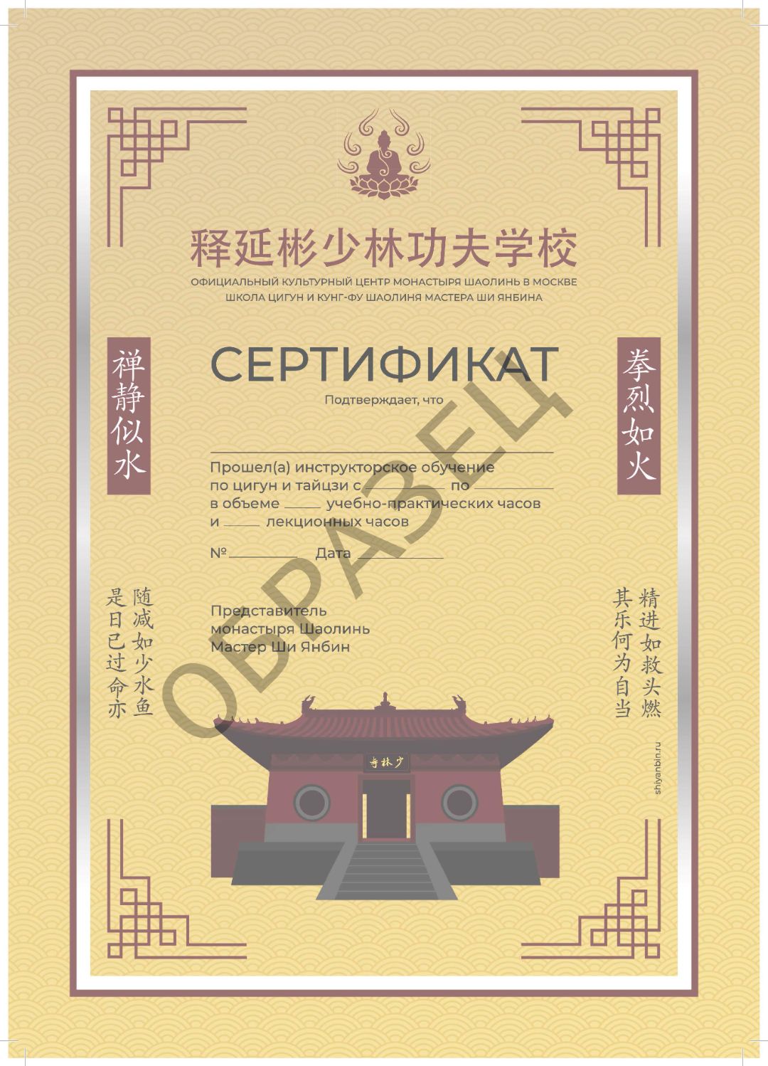 Сертификат официального культурного центра монастыря Шаолинь содержит учебные часы по каждой дисциплине и выдается за личной подписью воина-монаха монастыря Шаолинь. Вы можете получить этот сертификат в России, вам не надо жить в Китае год.